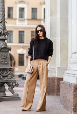 A refined beige trousers outfit with a silk or satin blouse is office-approved and brunch-ready. Add a belt and pointed-toe pumps for power dressing without effort.